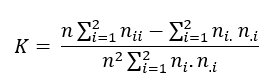 Cohen’s kappa coefficient(49) is another statistic based on the confusion matrix, measuring the difference between the observed map-reality agreement and that which could be expected simply by chance. The kappa coefficient for the two classes is calculated as follows: